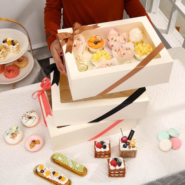 Both white cardstock and PET materials comply with food contact standards, ensuring safe and hygienic pastry packaging.